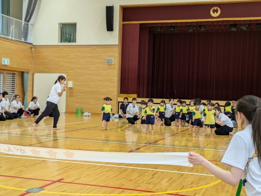 0~2歳児は体育館にて、保護者の方と一緒に運動遊びや親子ダンスを楽しみました。