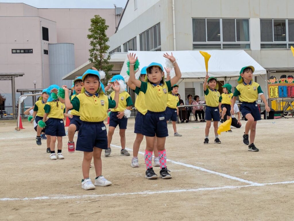 3~5歳児はグラウンドにて行いました。オープニングは全員で旗やポンポンを使ったダンス。