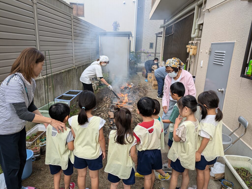 11月12日(火)、ふじの子保育園の畑でやきいもがありました。昨年度は壁紙工事の影響で、おいもパーティーのみ…。火を起こして焼くのは2年振りとなりました。