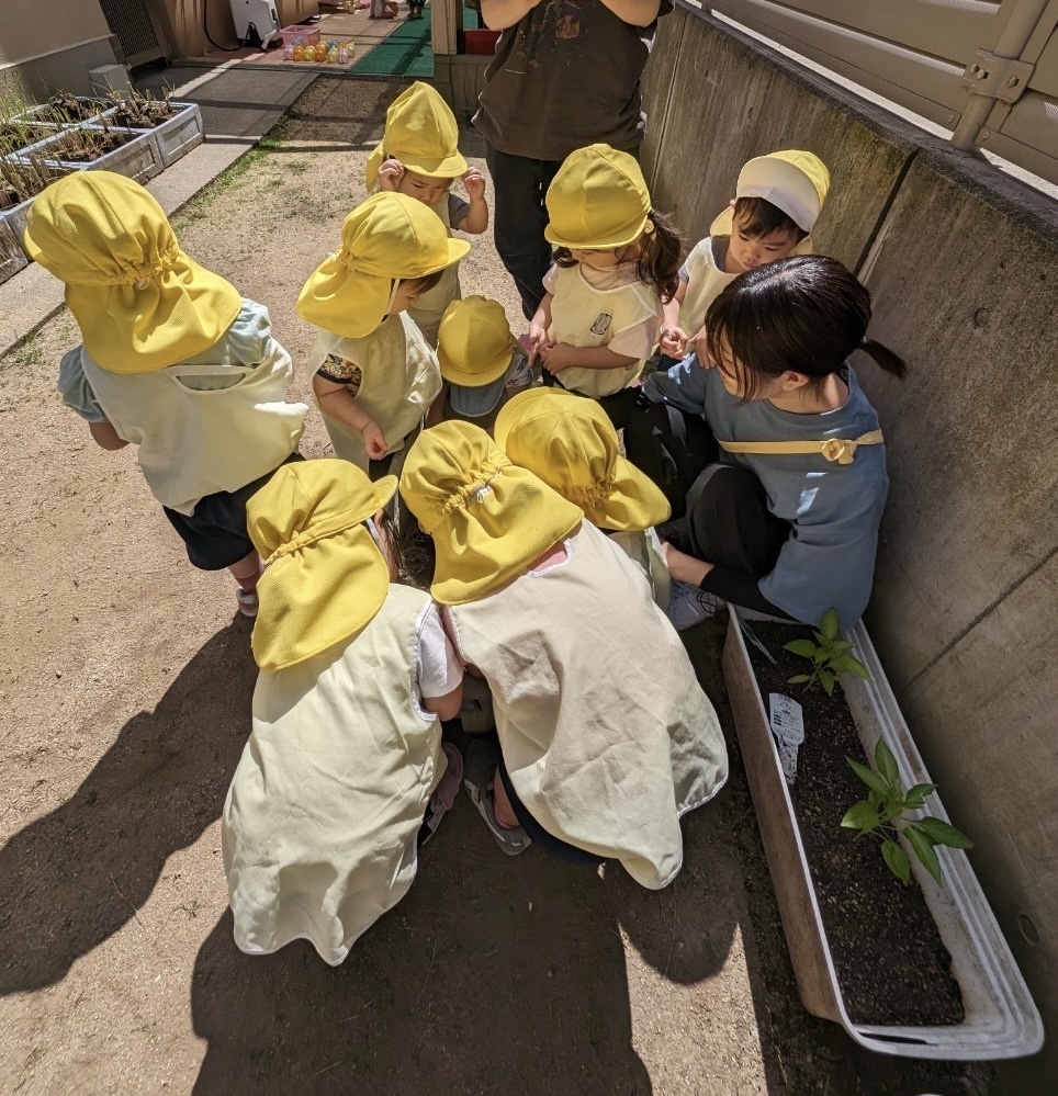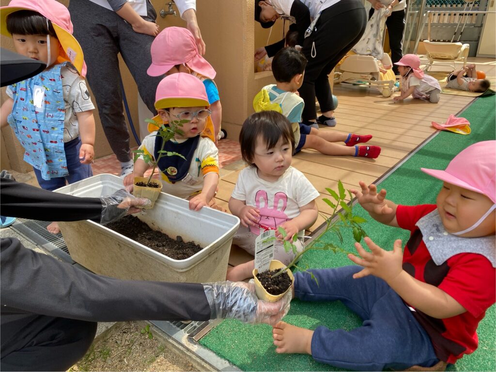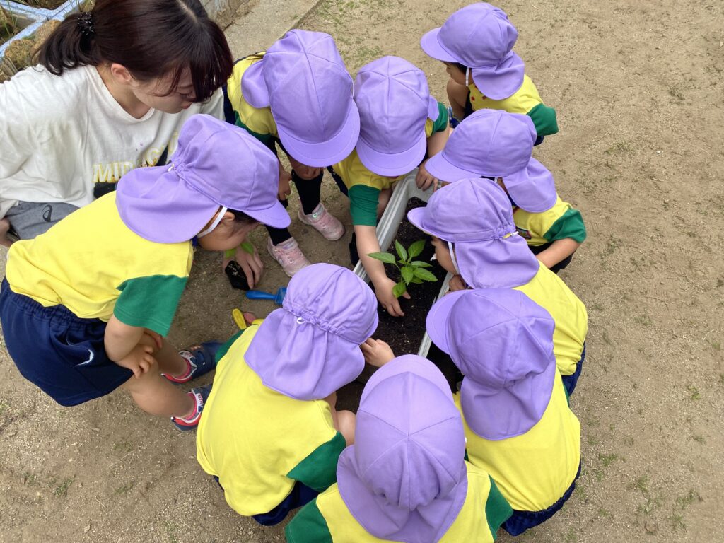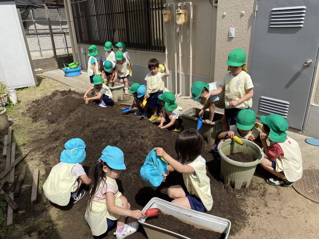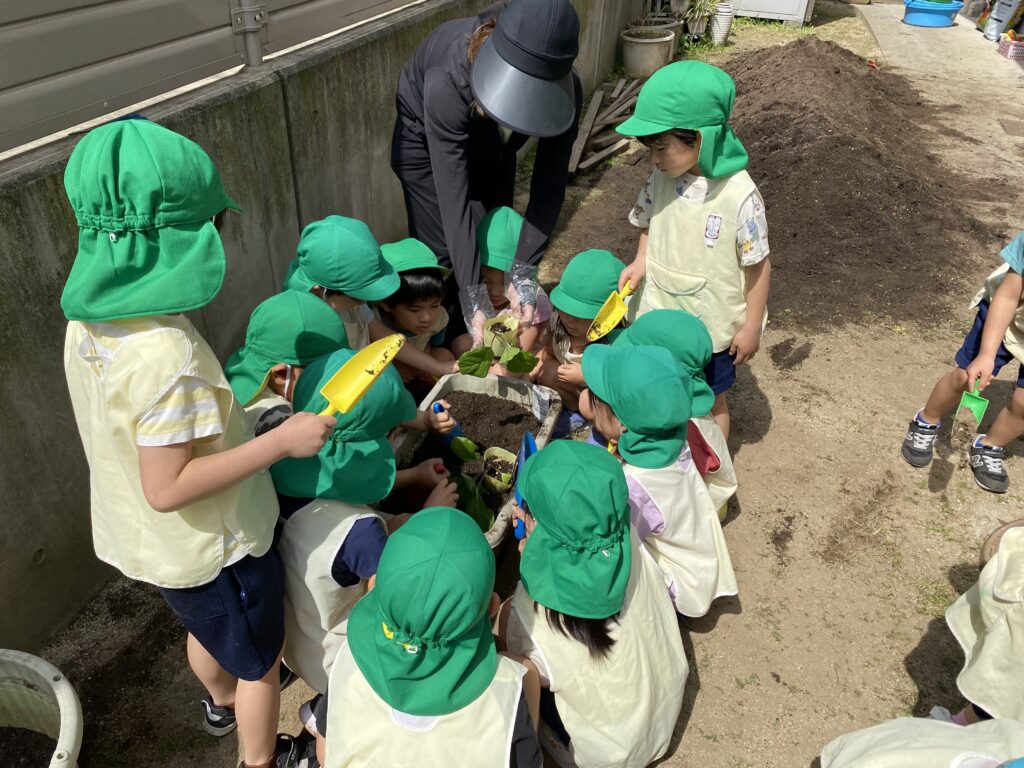 そして、各クラス保育者と一緒に夏野菜を植えました。