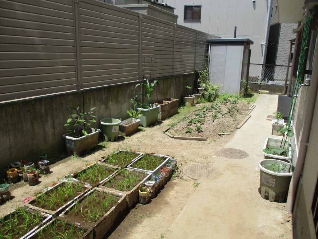 先月各クラスが植えた夏野菜たちも、すくすく生長中…