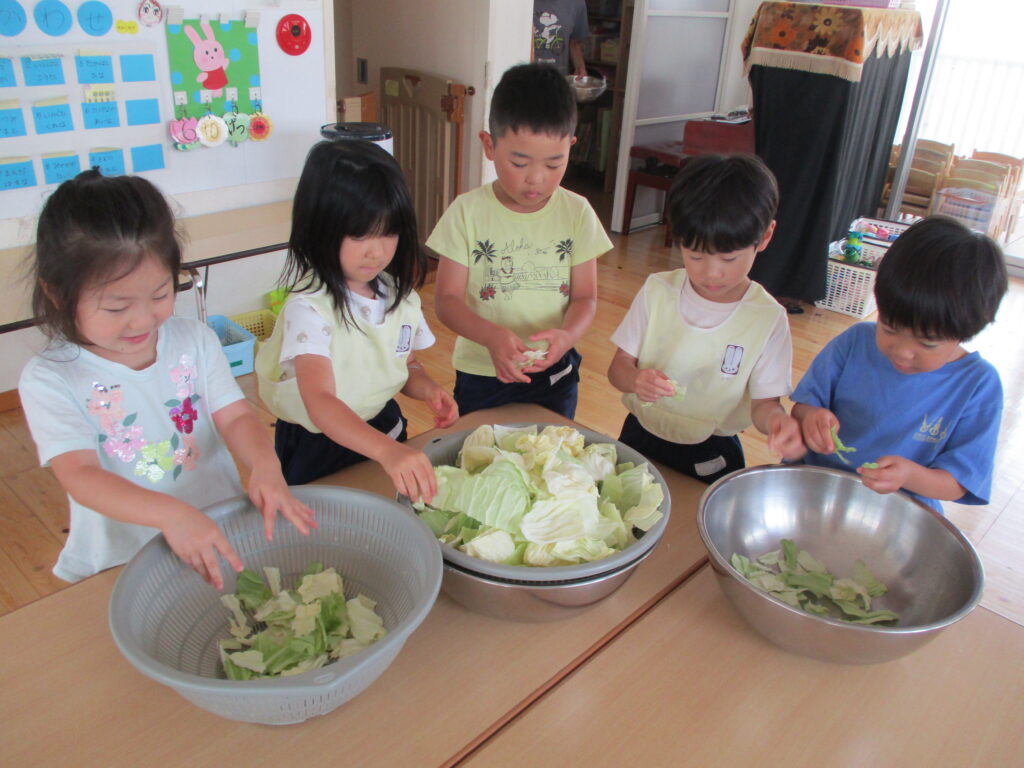 5歳児は毎月食体験があり、今月は【キャベツちぎり】でした。翌日の給食で提供されます。