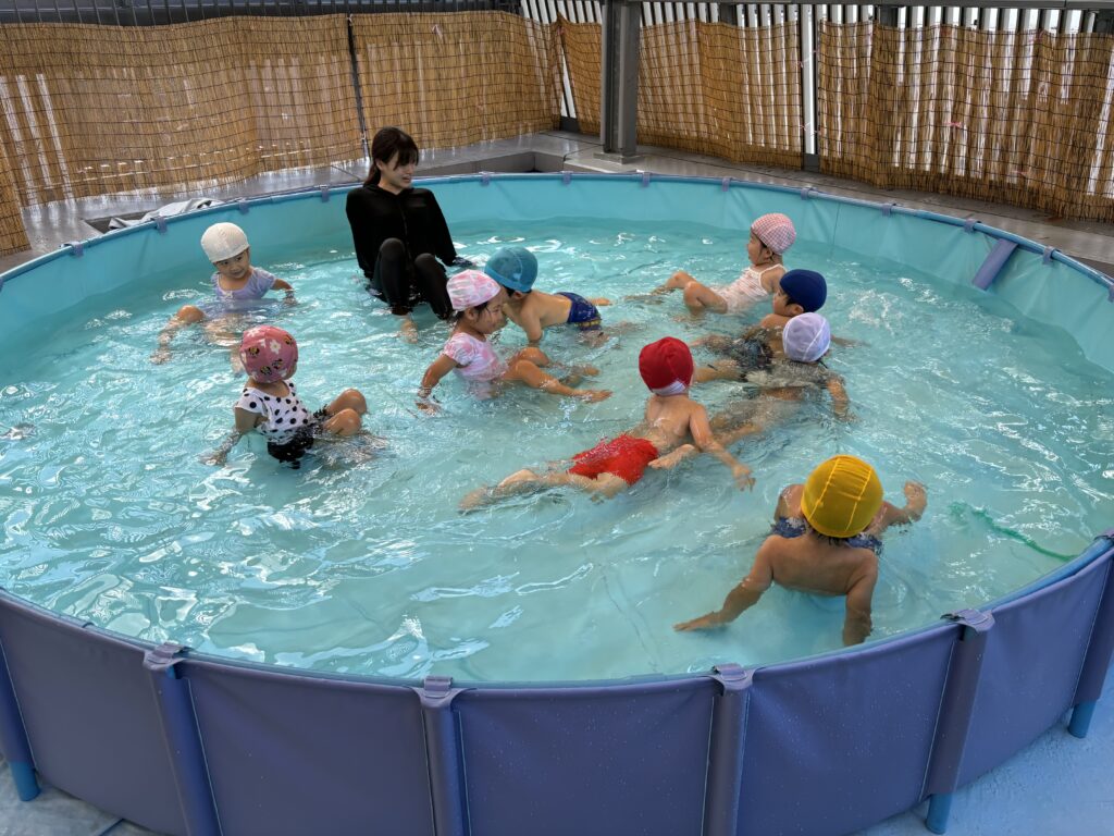 4・5歳児は、プールでの遊びが大好き!顔を水に付けたり様々な泳ぎ方を披露したり、0~3歳児とは違う姿で楽しむ様子が多かったです。