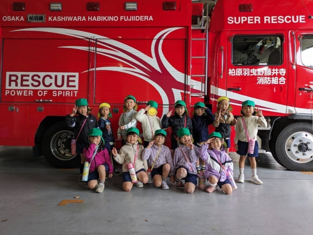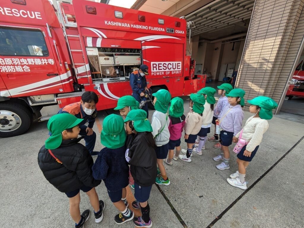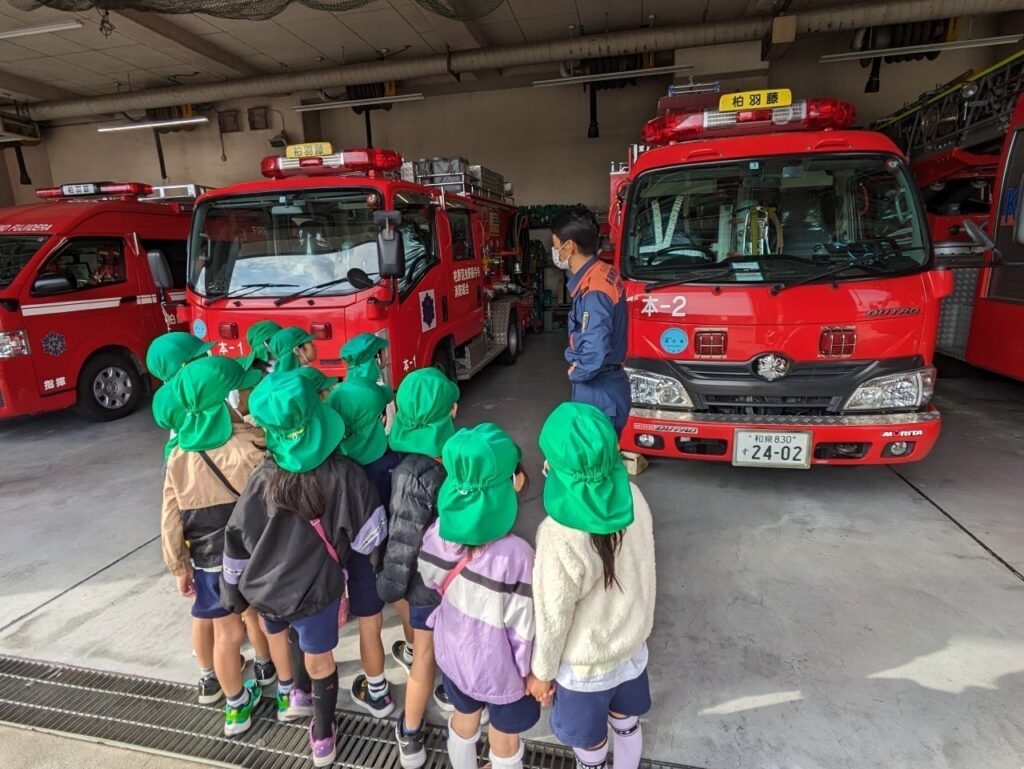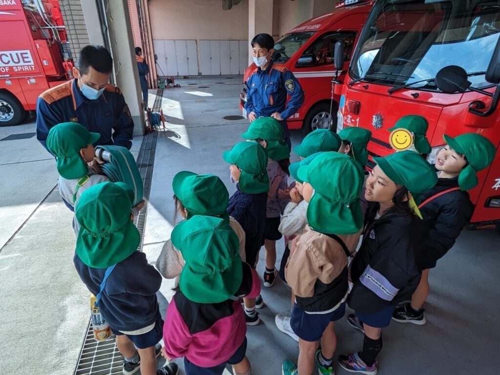 10月に消火訓練で消防士さん、消防車が来てくださったので