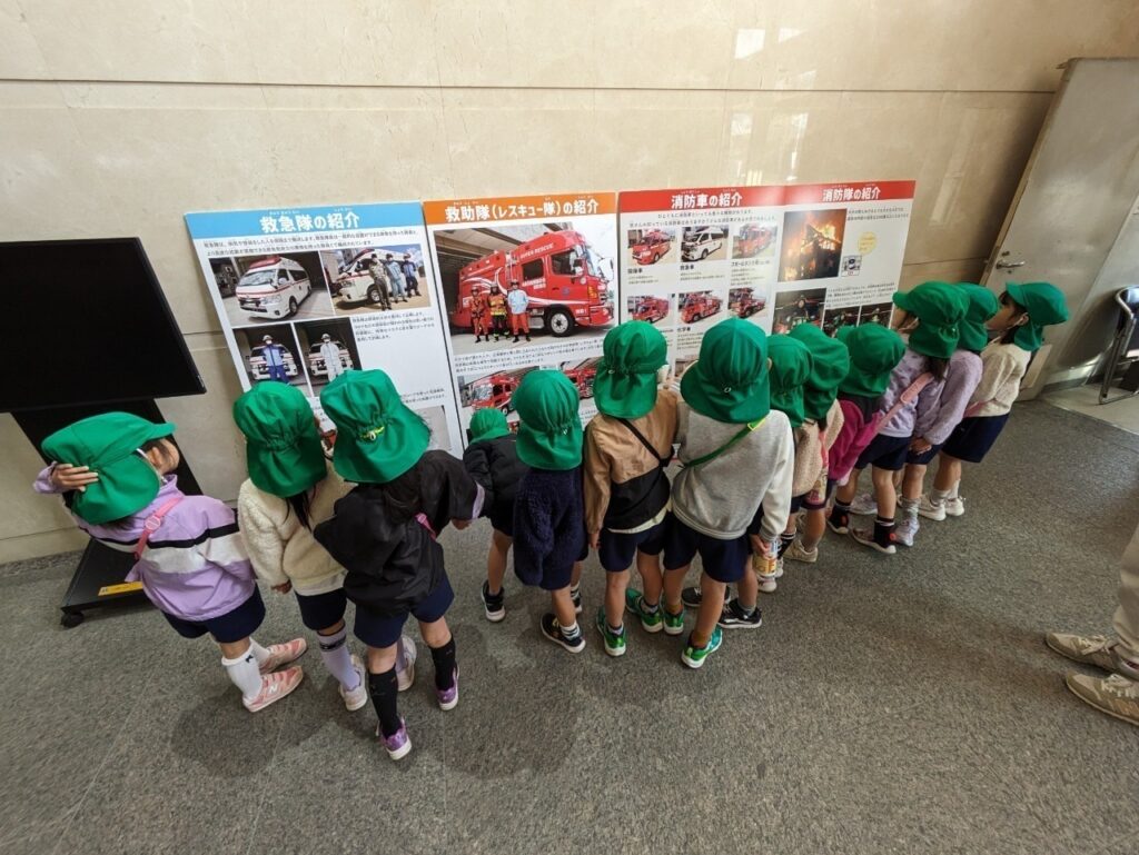 消防署の中にある紹介の看板を「これ知ってる!」「かっこいいなあ」と言いながら読んでいました。