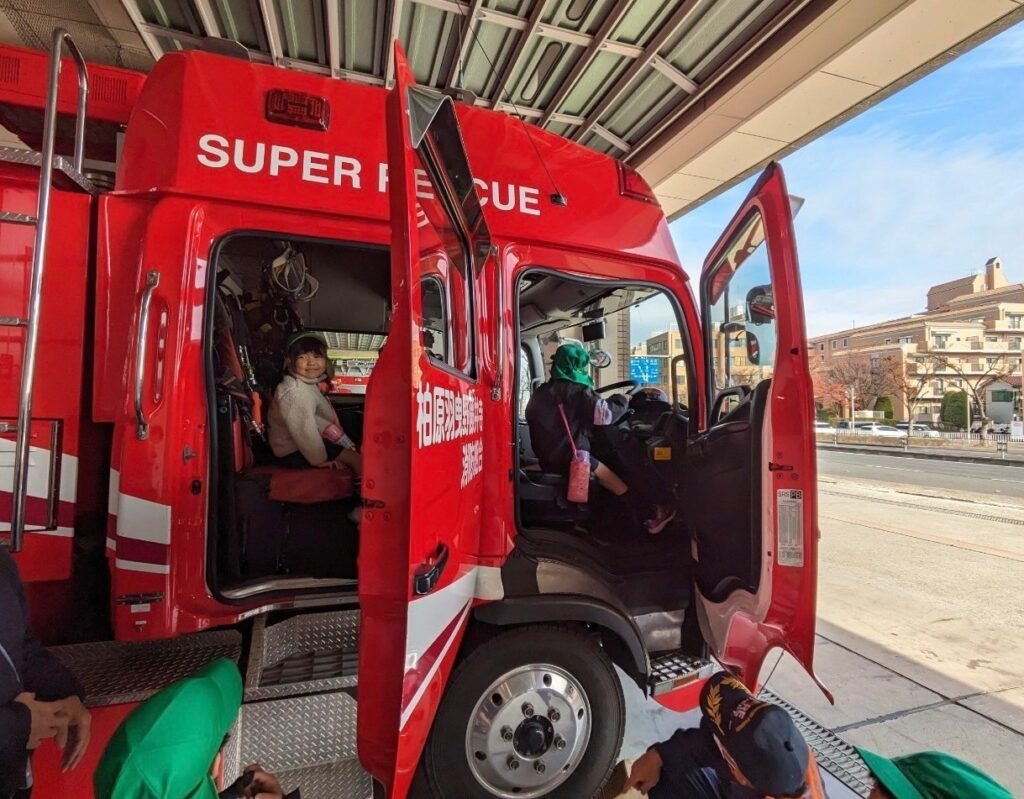 大きな消防車両に目をキラキラさせていましたが、どんな時に使うのかのお話を聞いている時は