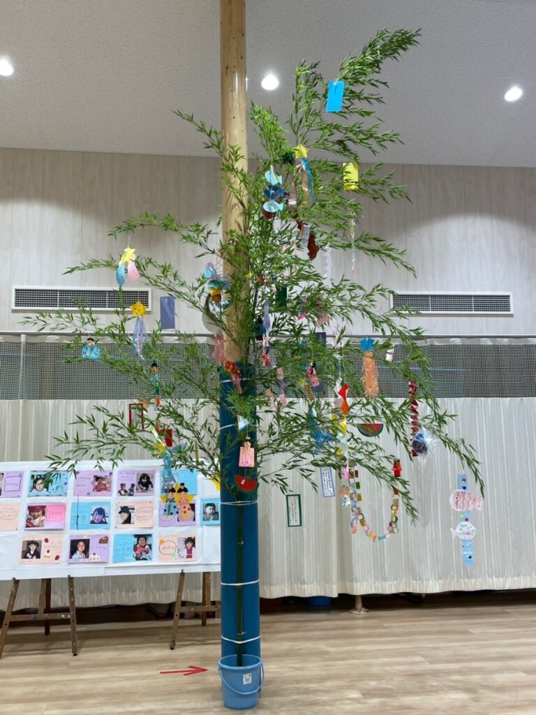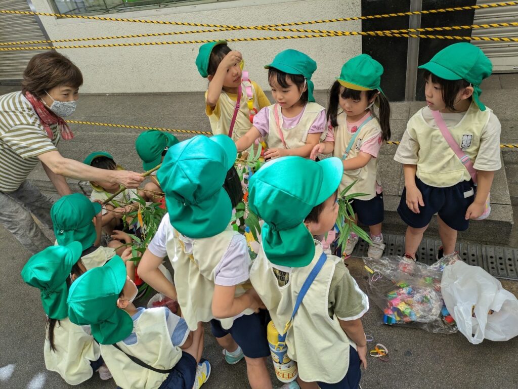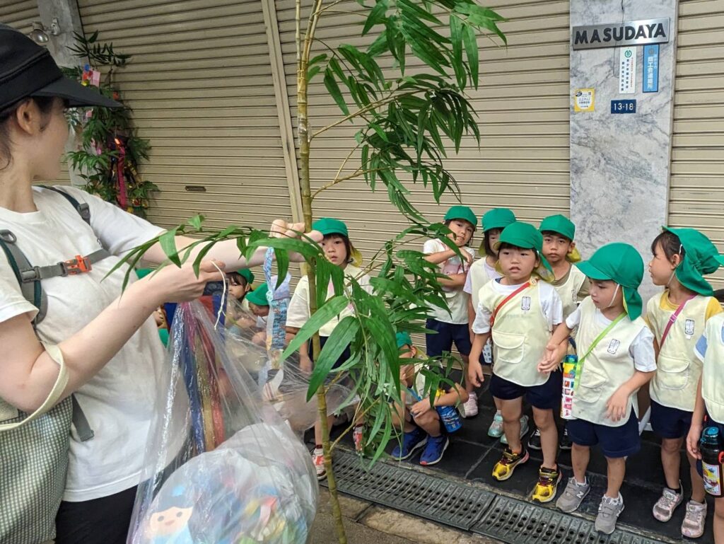 商店街へ飾る笹に保育園を代表してやまぐみが飾り付けに行きました♪