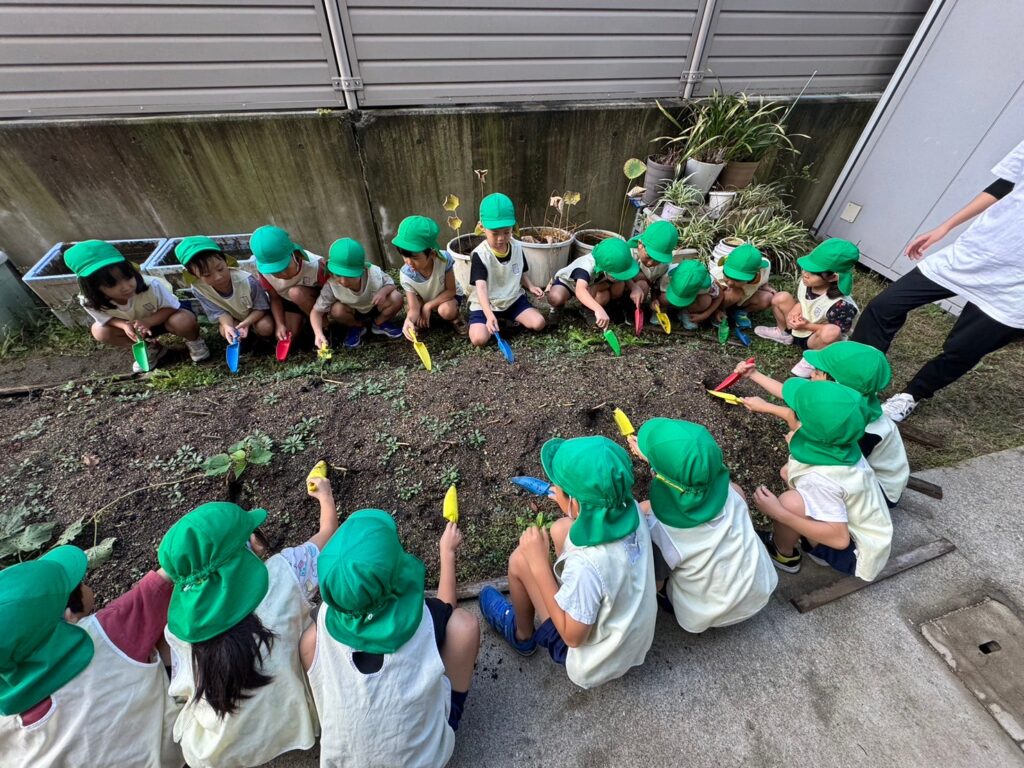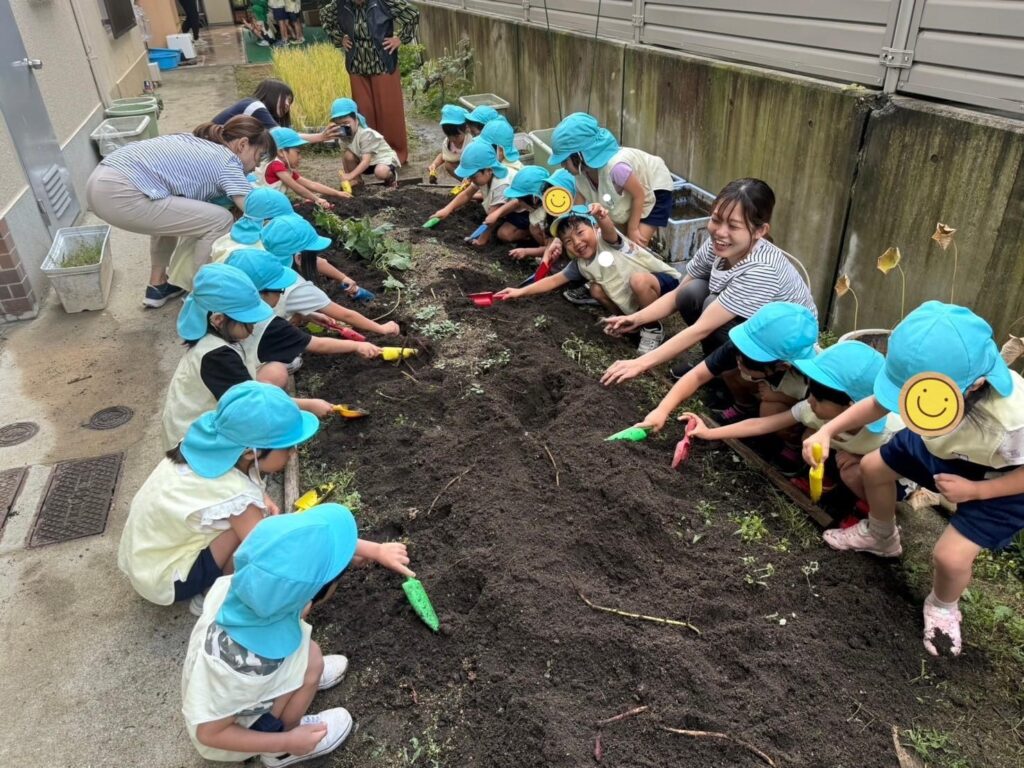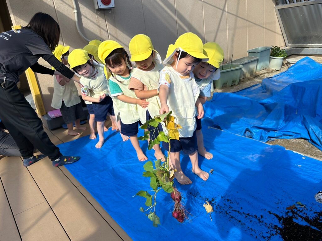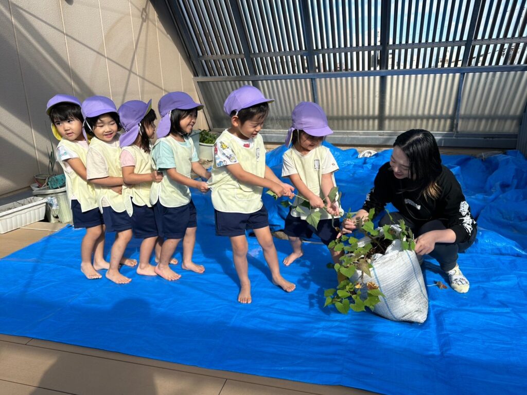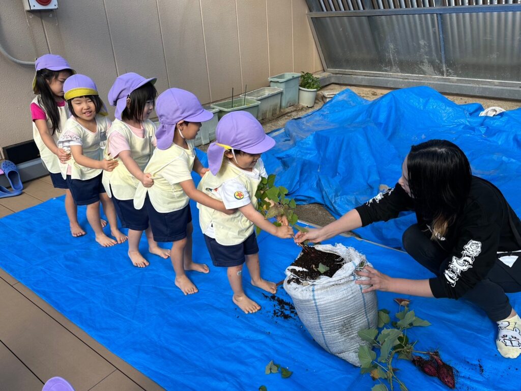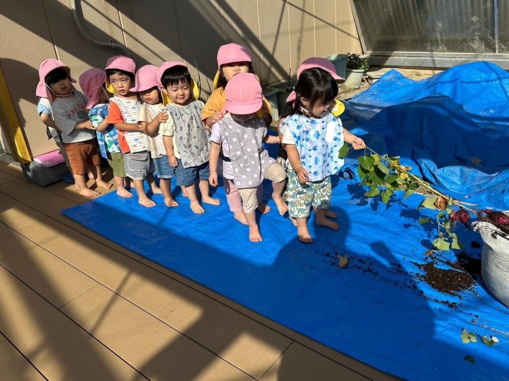 さくら・たんぽぽ・すみれぐみは二園の屋上園庭でいもほりをしました!