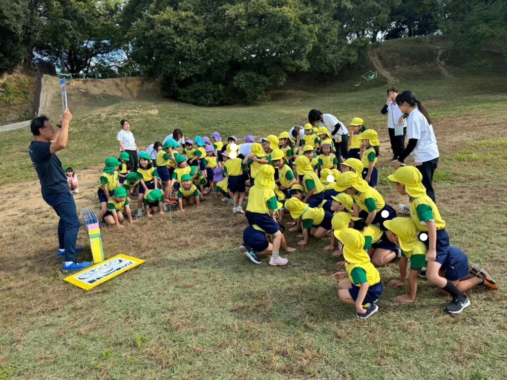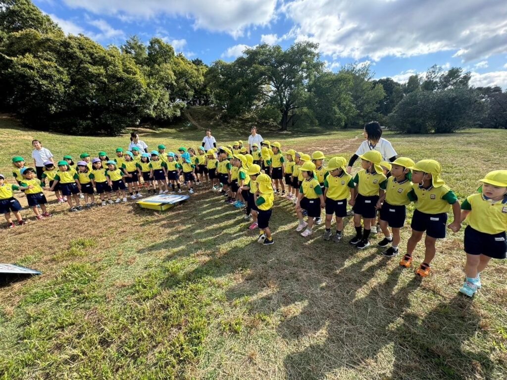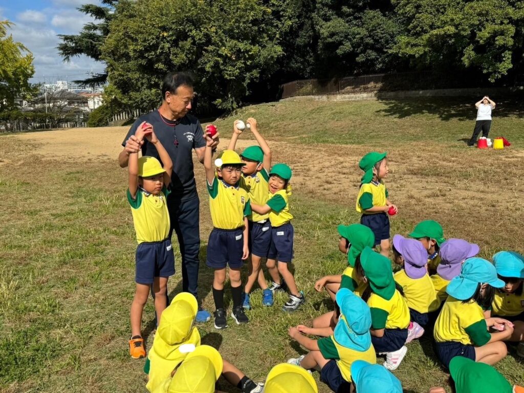 佐藤先生が紅白の玉をあちこちに隠すので、各園が協力して探します!