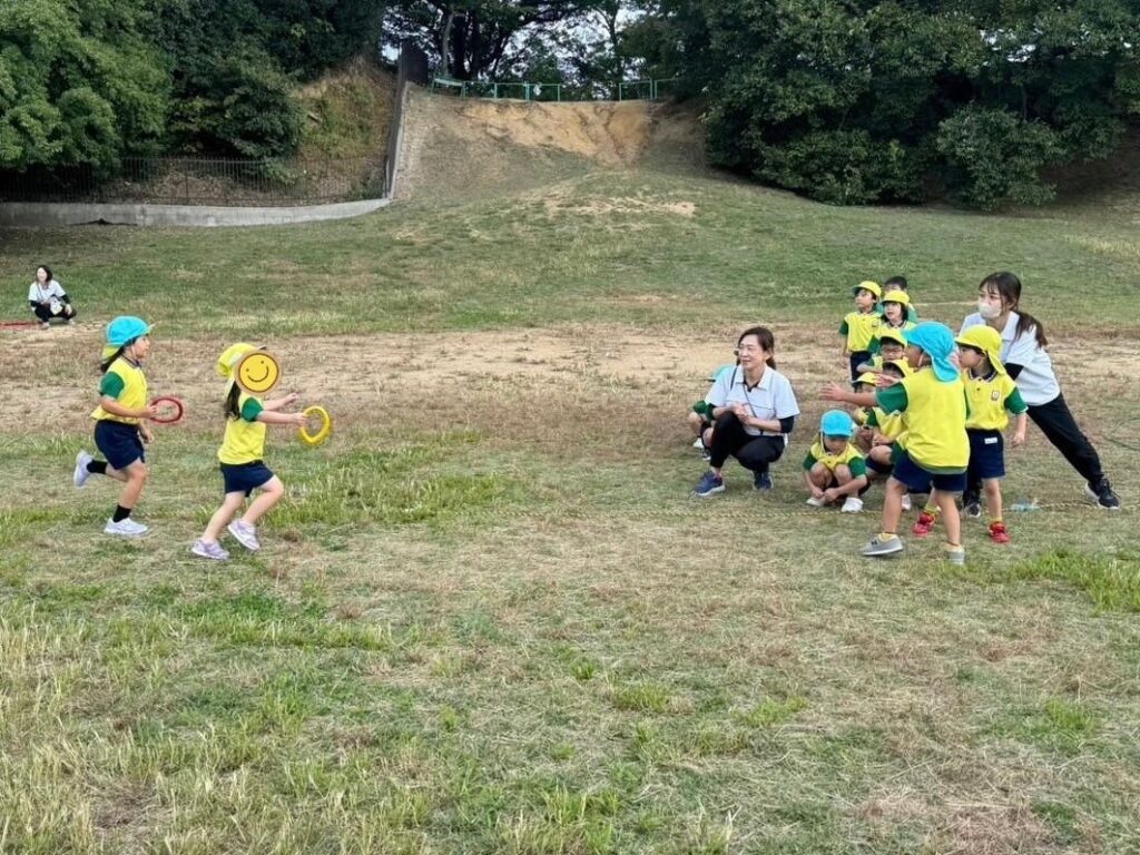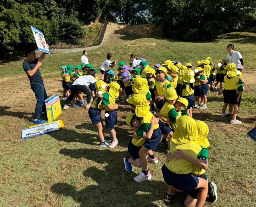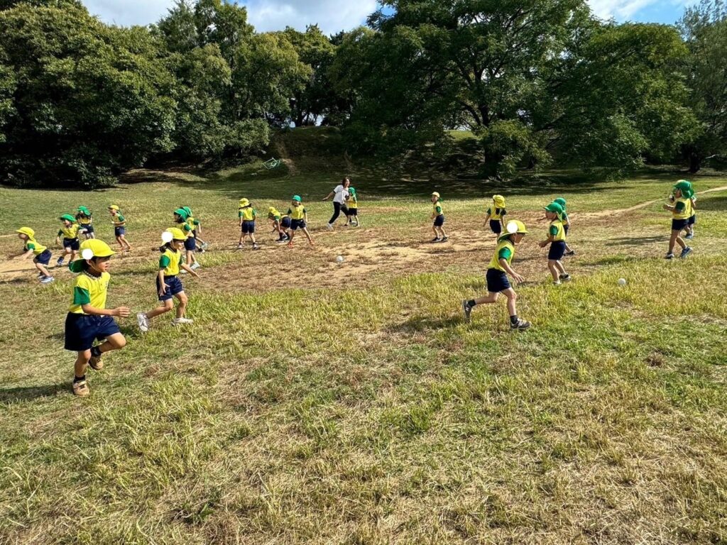 佐藤先生が鬼になり、捕まらないように子どもたちが逃げ、