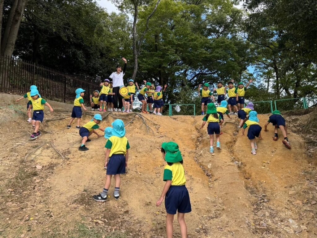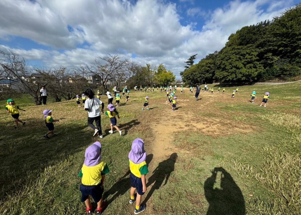 本園が来るまで自由遊び。「よーい、どん!」の掛け声とともにお山まで一直線!