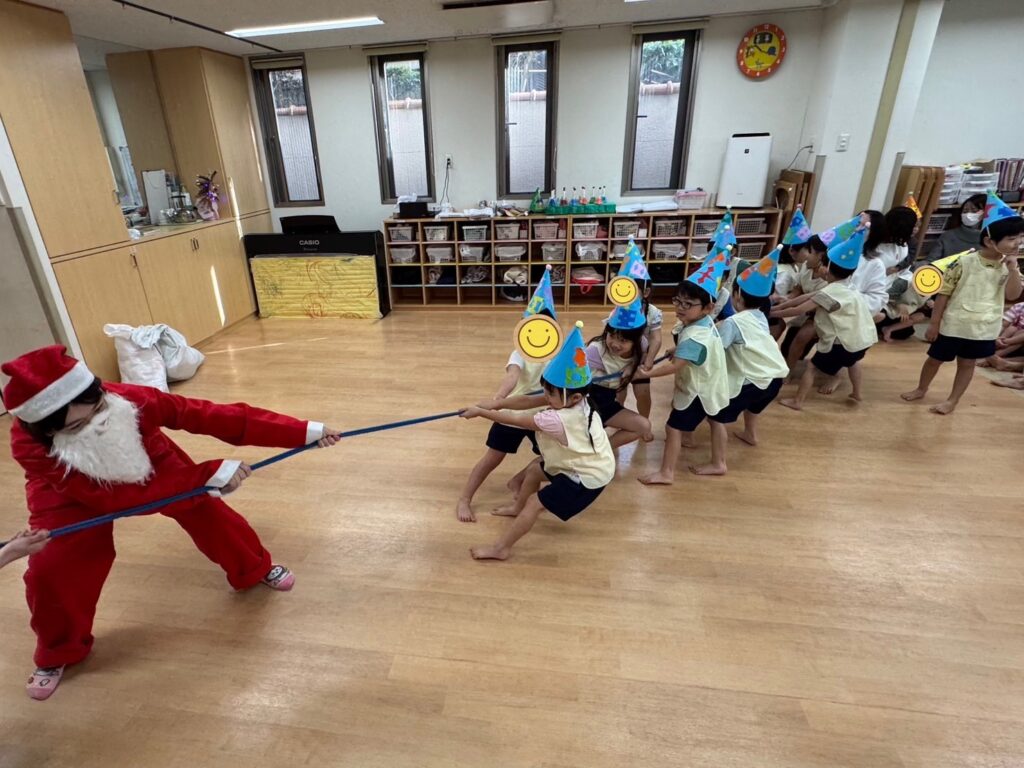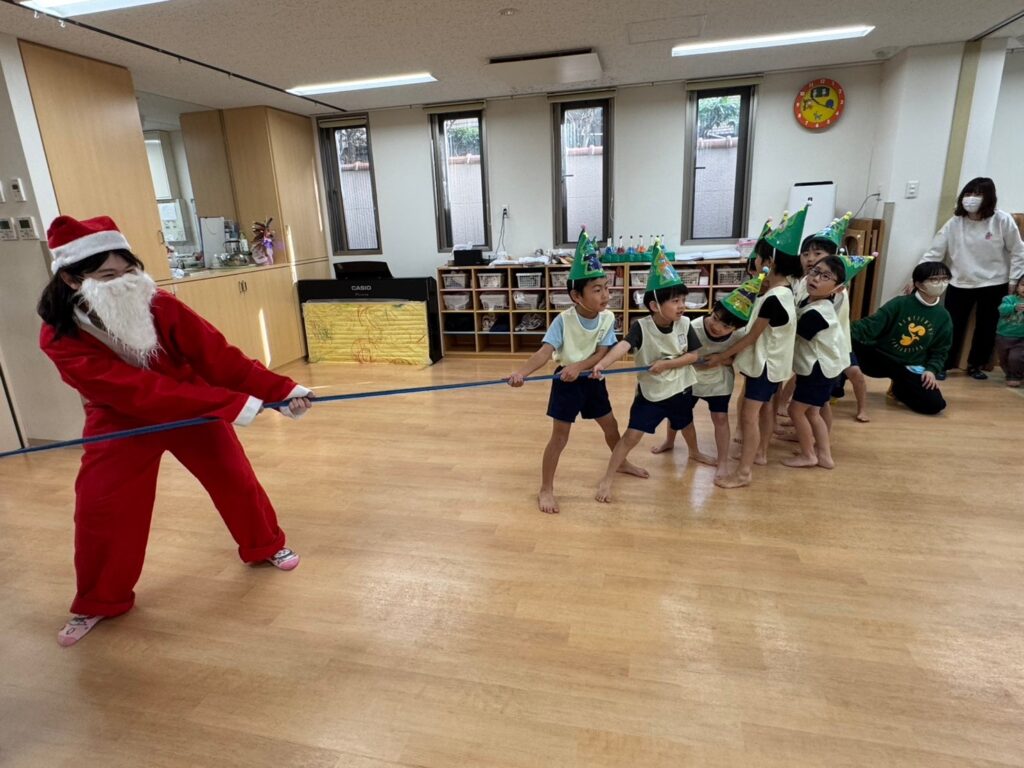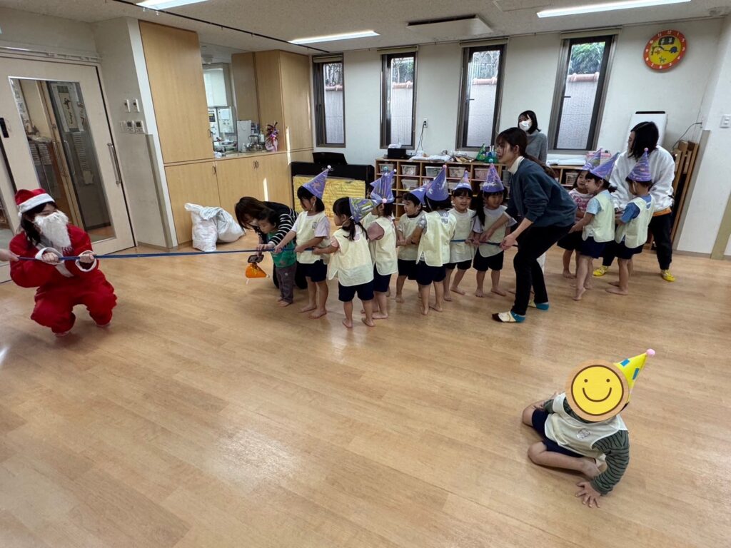 すみれ、そら、やまぐみはサンタさんと一緒に綱引きをして遊びました。