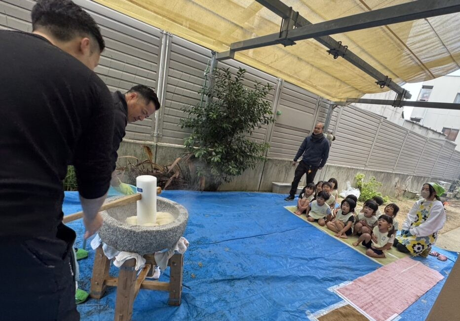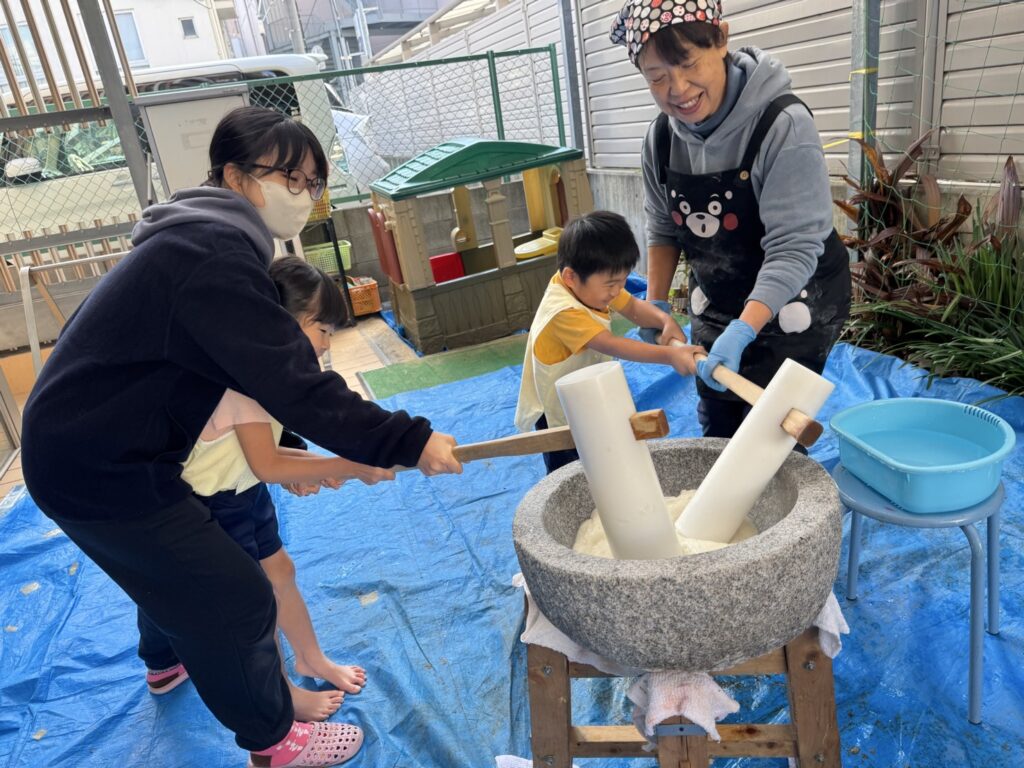 杵のずっしりとした重みに驚きながらも先生と一緒に頑張りました。
