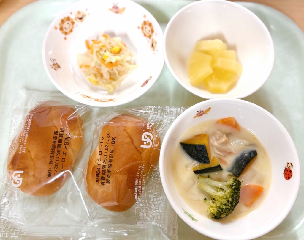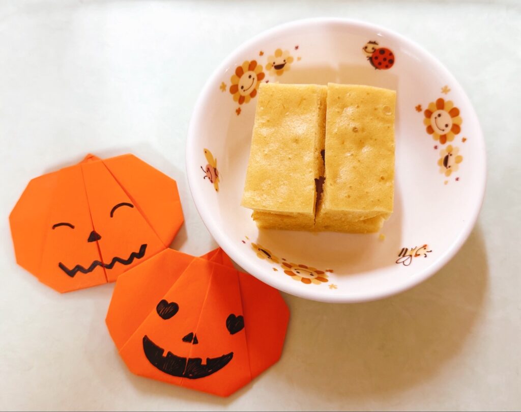 給食もハロウィン仕様で、ジャック・オ・ランタンにちなんだかぼちゃメニューです。