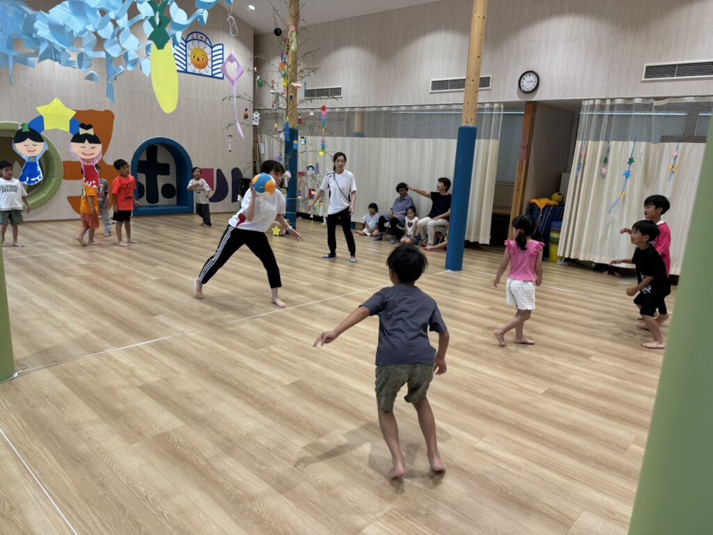 夏らしいBGMが流れる中、輪投げを楽しんだり、保護者の方に短冊へ願い事を書いていただいたり