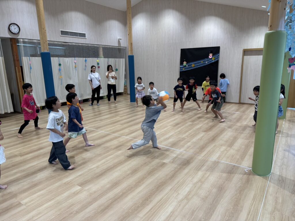 裸足、そして汗もかきながら保育者たちも気合十分でした。笑